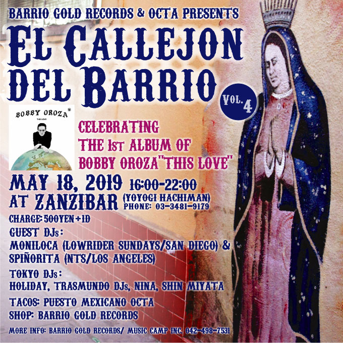 BARRIO GOLD RECORDS & OCTA Presents EL CALLEJON DEL BARRIO Vol.4 CELEBRATING THE RELEASE OF BOBBY OROZA “THIS LOVE” 5/18 代々木八幡ザンジバル ZANZIBAR (Yoyogi Hachiman) 03-3481-9179 16:00-22:00 CHARGE: 500YEN + 1D |