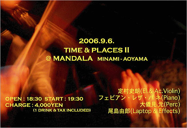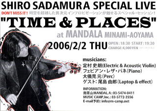 時空を超越した異次元インプロビゼーションが魅せる スペシャル・セッション!! “SHIRO SADAMURA SPECIAL LIVE at MANDALA MINAMI-AOYAMA” 『TIME & PLACES』 ![]() ![]() 2006/2/2 (THU) OPEN 18:30 START 19:30 CHARGE 4000円(1ドリンク付・税込) musicians: 定村史朗 (Electric & Acoustic Violin) フェビアン・レザ・パネ(Piano) 大儀見元(Perc) ゲスト:尾島由郎(Laptop & effect) <お問い合わせ> 南青山MANDALA:03-5474-0411 MUSIC CAMP, Inc.:03-5772-3556 E-mailでの予約受付は終了いたしました。 ご予約は本日(2/2)16:00まで電話(03-5772-3556)にて承ります。 前回のライヴを見逃した方、ぜひ今回はご来場ください!! ![]() 2005/6/1 STB139スイートベイジルでのアルバム発売記念ライブより 写真:Rie Kasahara |