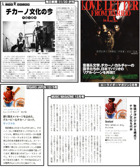 <ケッツァル> 『政治と愛』で99年鮮烈デビュー。イーストLAを拠点に活動する最重要チカーノ・ロック・バンドのひとつ。高い社会意識に基づいた鋭い歌詞をロック、ファンク、クラシック、メキシカンが重層するダンサブルで詩情豊かなサウンドと融合したサウンドは日本でも高い評価を獲得している。11月通算4枚目になる新作『ダイ・カウボーイ・ダイ』を発売。メンバーを一新し、力強いルーツ・ミュージックからモリッシーに影響を受けた繊細なナンバーまで、多彩で骨太のサウンドはさらに完成度を高めている。
